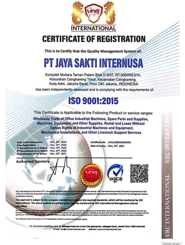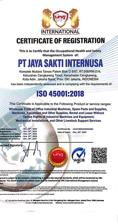 Sertifikasi ISO 45001 membuktikan komitmen kami terhadap keselamatan kerja dan lingkungan produksi yang bertanggung jawab. Ini artinya, Anda tidak hanya mendapatkan produk berkualitas tinggi, tetapi juga keyakinan bahwa produk tersebut dibuat dengan standar etika dan keamanan tertinggi.