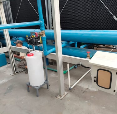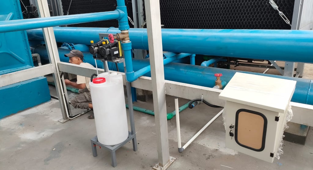 Dosing Terukur: Berdasarkan pengaturan atau data dari sensor, panel kontrol akan mengaktifkan pompa dosis. Pompa ini akan menarik bahan kimia dari tangki dan menyuntikkannya ke dalam aliran air cooling tower dalam jumlah yang presisi.
